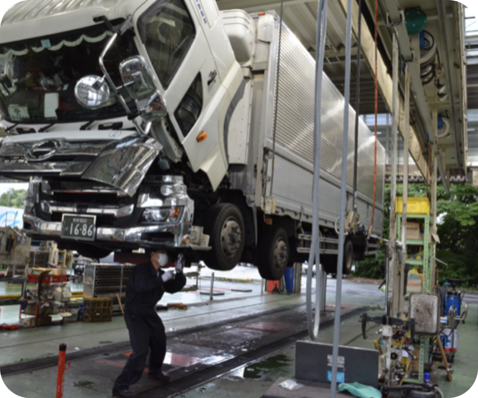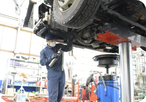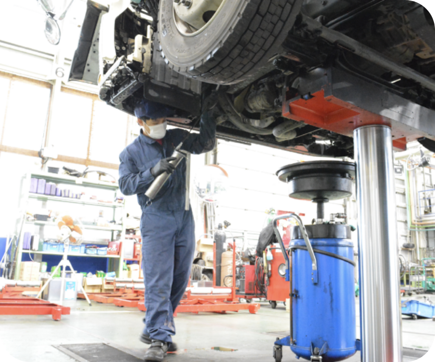 指定自動車整備事業(国指定の民間車検工場)で、大型自動車の整備を経験豊富なメカニックスタッフといつも元気で笑顔のフロントスタッフが丁寧に対応いたします。